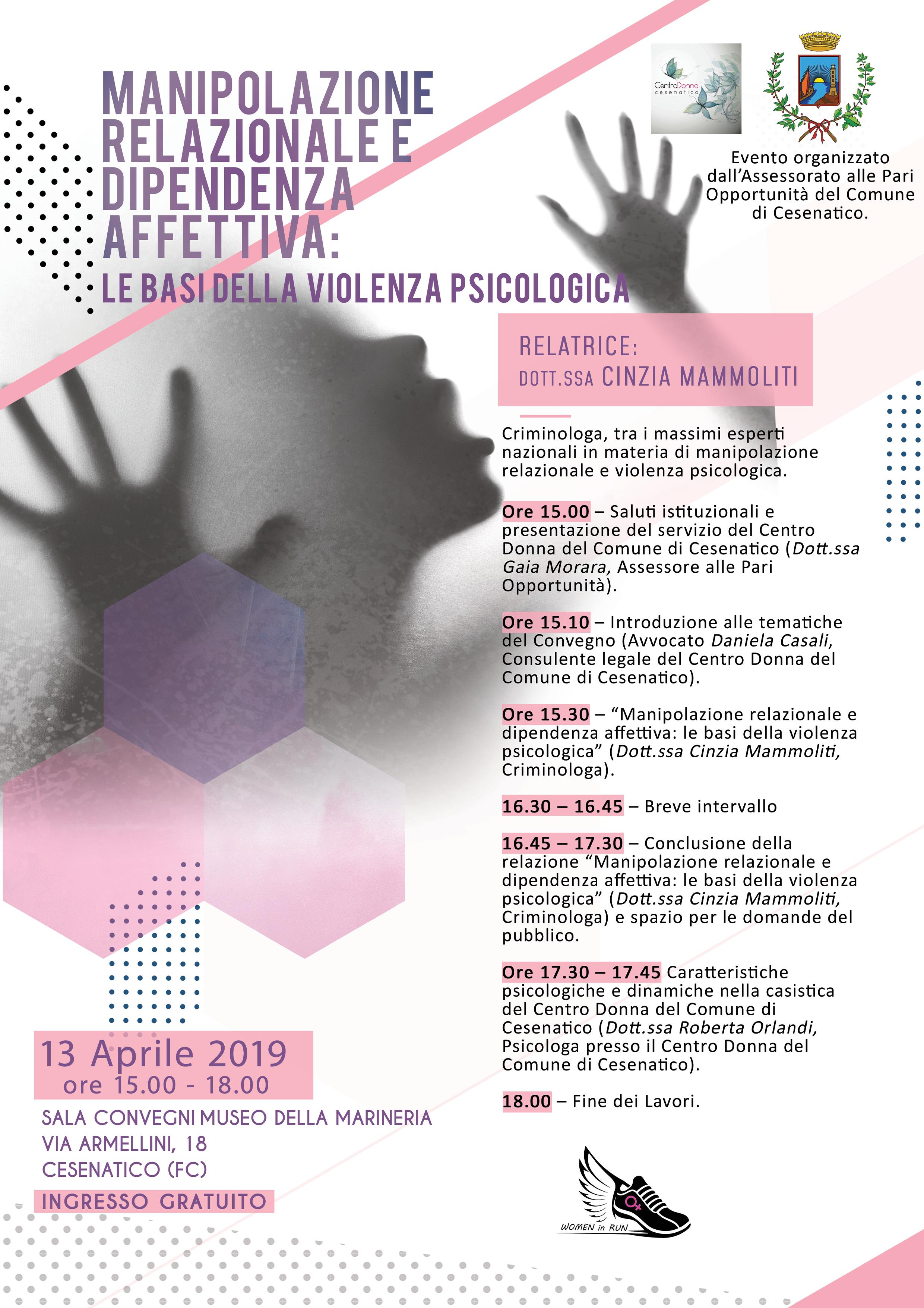 L’Assessorato alle Pari Opportunità del Comune di Cesenatico, in collaborazione con il Centro Donna Cesenatico organizza un convegno mirato alla conoscenza approfondita del fenomeno di violenza e manipolazione psicologica in un contesto di fiducia relazionale