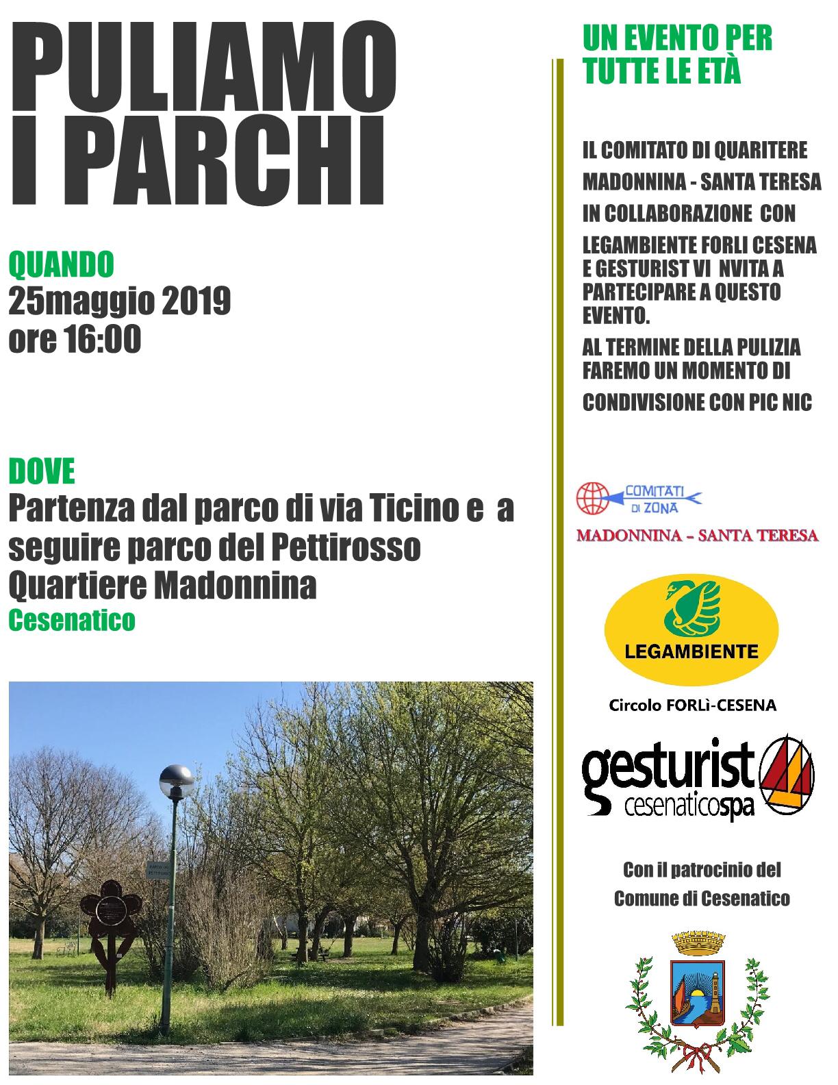 Il primo evento in programma, organizzato in collaborazione con il Comitato di Quartiere Madonnina – Santa Teresa e Gesturist Cesenatico Spa per sabato 25 maggio, prevede la pulizia dei parchi del Pettirosso e di Via Ticino nel Quartiere Madonnina. A tutte le persone interessate a dare il proprio contributo per la buona riuscita dell’iniziativa, diamo appuntamento alle ore 16:00 presso il parco di via Ticino. Al termine della pulizia è previsto un momento di condivisione fra tutti i partecipanti e un pic-nic.