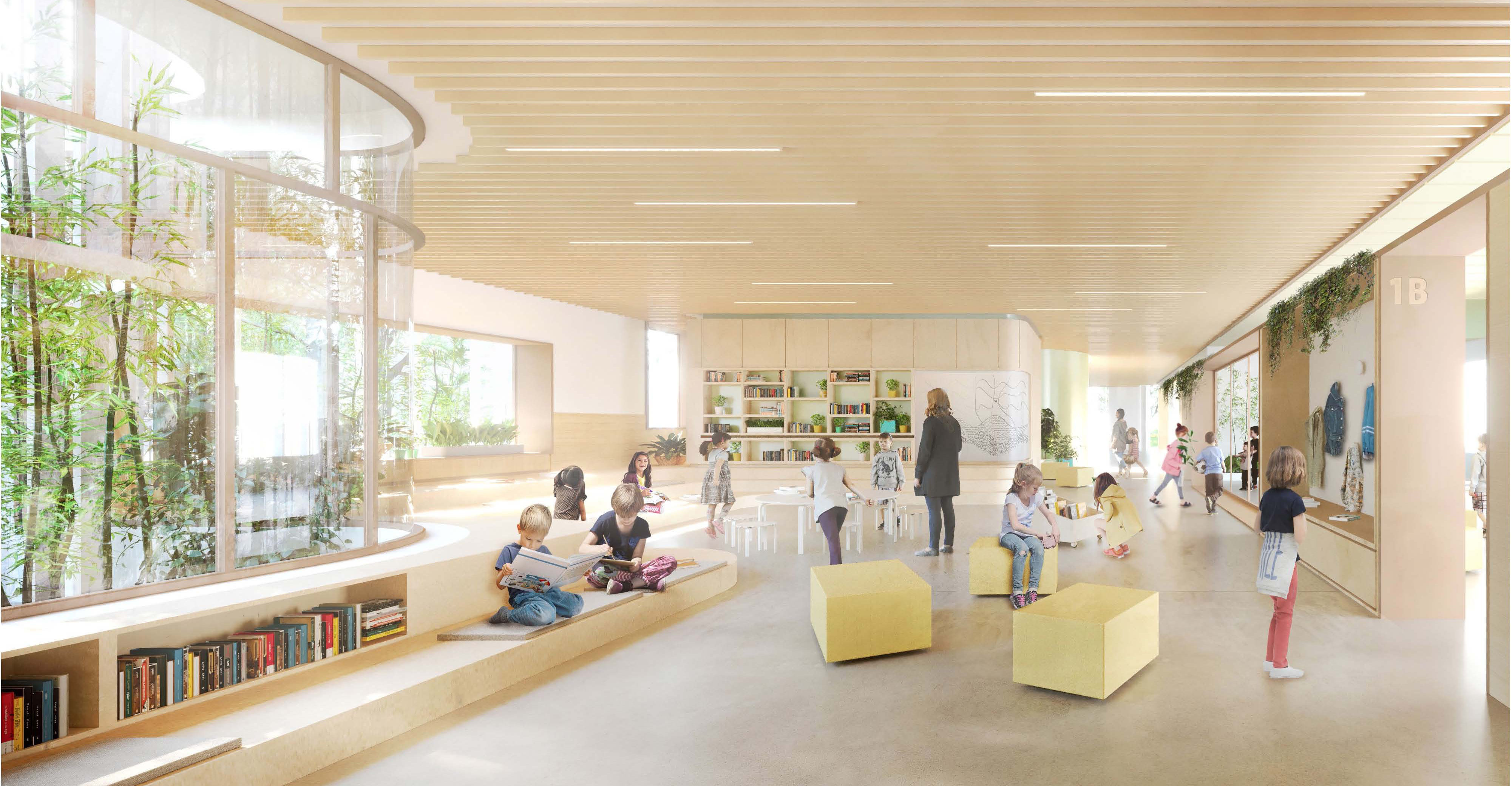 La piazza lineare non è solo il luogo di distribuzione alle aule, ma un vero e proprio cuore della scuola uno spazio polifunzionale che costituisce sia una biblioteca diffusa che un ambiente adattabile alle esigenze della didattica, il cluster ovvero combinazione aula laboratorio consente uno sviluppo didattico innovativo e con la possibilità di lavorare per gruppi di alunni anche di aule differenti, infine lo spazio atrio-auditorium diventa il luogo di rappresentanza accogliendo non solo l’atrio passante ma anche una vera e propria agorà a doppia altezza che si apre su un aula polifunzionale vetrata e si estende all’esterno con una gradonata verde.
