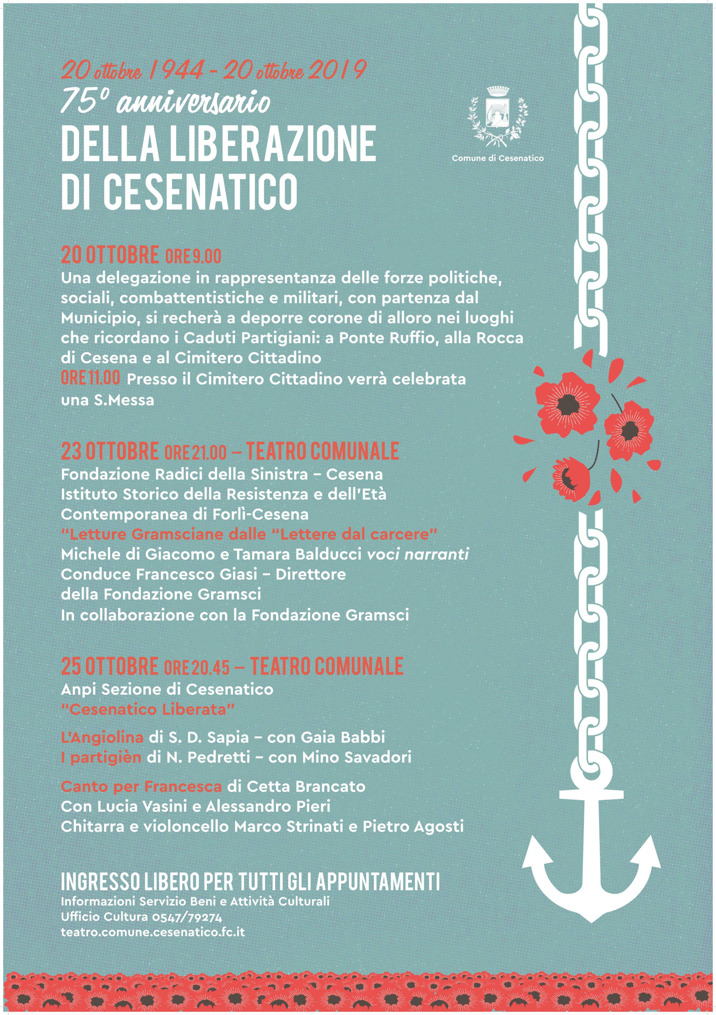 Venerdì 25 ottobre, alle ore 20.45, presso il Teatro Comunale, la Sezione di Cesenatico dell’Anpi presenta “Cesenatico Liberata”, uno spettacolo in musica e parole che omaggiano Cesenatico e i sui ricordi nel periodo della Resistenza, con le voci narranti di Gaia Babbi, Mino Savadori, Lucia Vasini, Alessandro Pieri, accompagnati da chitarra e violoncello di Marco Strinati e Pietro Agosti.