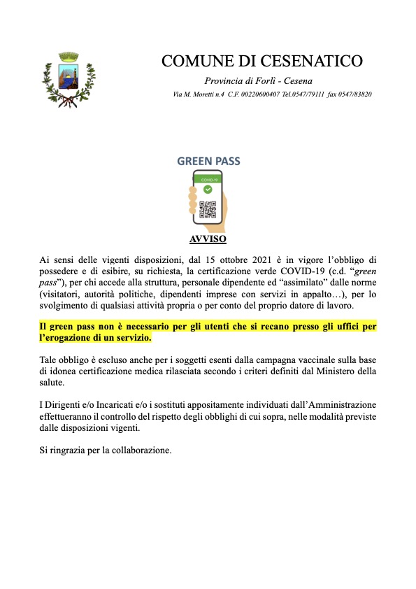 Ai sensi delle vigenti disposizioni, dal 15 ottobre 2021 è in vigore l’obbligo di possedere e di esibire, su richiesta, la certificazione verde COVID-19 (c.d. “green pass”), per chi accede alla struttura, personale dipendente ed “assimilato” dalle norme (visitatori, autorità politiche, dipendenti imprese con servizi in appalto…), per lo svolgimento di qualsiasi attività propria o per conto del proprio datore di lavoro.