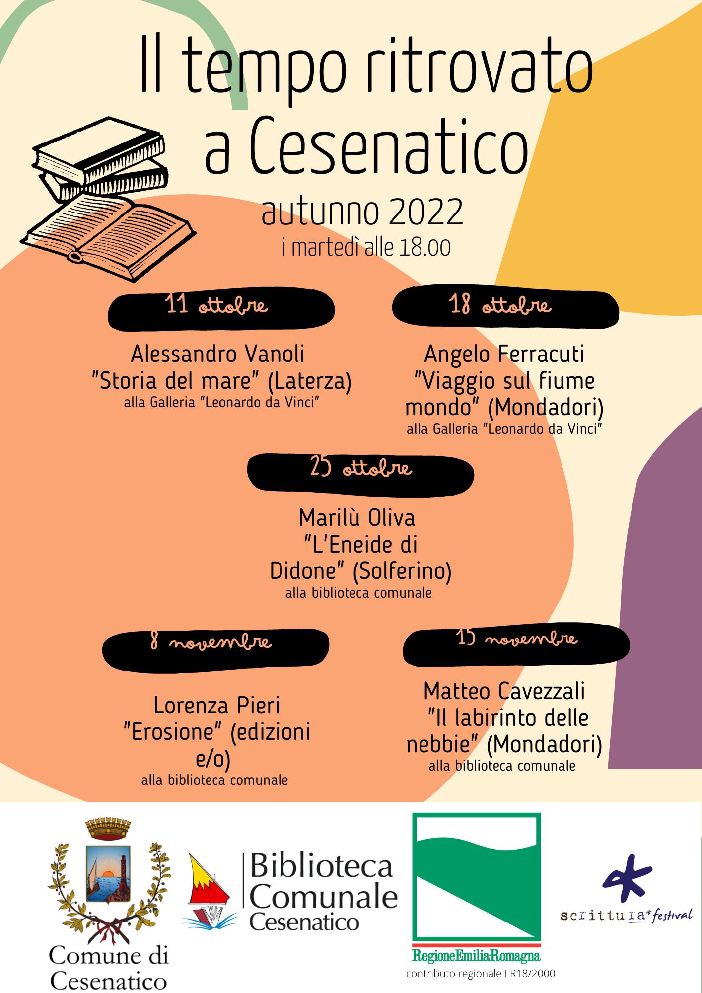 Le parole di Cesenatico cominciano a risuonare con la nuova rassegna letteraria che partirà l'11 ottobre e terrà compagnia ogni martedì per 5 appuntamenti a tutti i lettori che frequentano e amano la Biblioteca Comunale. "Il tempo ritrovato a Cesenatico" - sotto la direzione artistica dello scrittore ravennate Matteo Cavezzali - impreziosisce l'autunno culturale della città che trova un appuntamento inedito e nuovo da affiancare alla stagione teatrale e a tutte le altre iniziative che partiranno. Gli incontri sono in programma ogni martedì alle ore 18 all'interno della Biblioteca Comunale e della Galleria Comunale e cominceranno l'11 ottobre con lo storico e divulgatore Alessandro Vanoli che parlerà del suo "Storia del mare" (Laterza); si prosegue martedì 18 ottobre con Angelo Ferracuti, scrittore ed esploratore marchigiano che racconterà dieci anni di esplorazioni lungo il Rio delle Amazzoni con "Viaggio sul fiume del mondo" (Mondadori); il 25 ottobre sarà la volta di Marilù Oliva con "L'Eneide di Didone" (Solferino) e "L'Odissea di Penelope" (Solferino) ripercorrendo i viaggi mitici partendo dalle figure femminili più celebri: Penelope, Circe e Atena. L'8 novembre toccherà alla scrittrice italo-americana Lorenza Pieri con il suo "Erosione" (Edizioni E/O) dove si racconta la Chesapeake Bay, costa atlantica degli Stati Uniti, una zona in cui la terra deve sempre fare i conti con l'acqua. Il 15 novembre il gran finale con Matteo Cavezzali che ci porterà dentro la Romagna e dentro il delta del Po con i misterti e miti arcaici del suo ultimo romanzo "Il labirinto delle nebbie" (Mondadori).