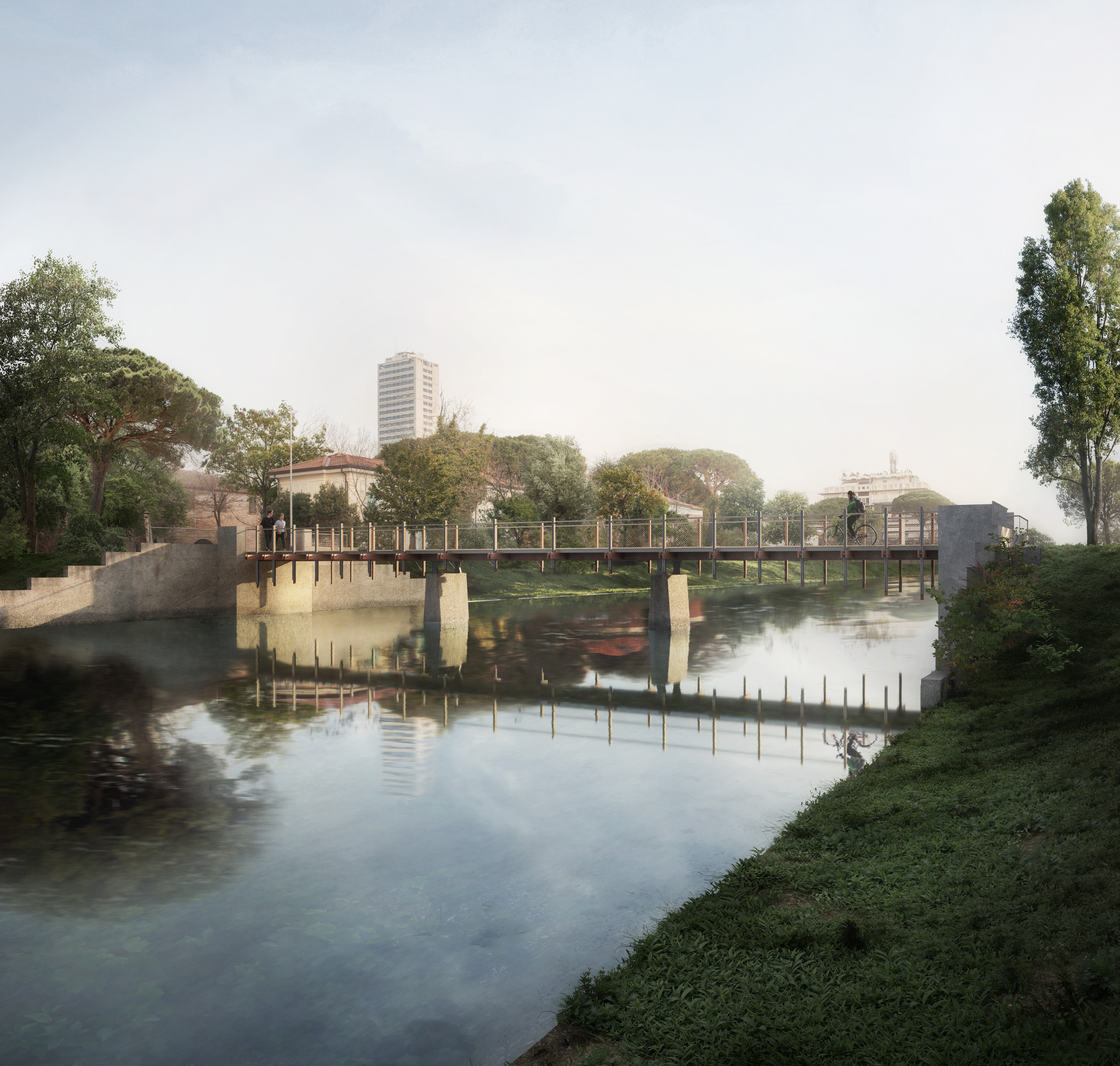 La fase delle demolizioni prevede la rimozione dell’impalcato esistente e di tutte le sottostrutture portate, tra le quali parapetti, pavimentazioni e travi longitudinali e trasversali, ovvero la totalità degli elementi esistenti affetti da grande degrado. Lo scopo del progetto è quello di mantenere leggerezza, con un disegno armonico e una prospettiva ad arco. La pavimentazione sarà formata da doghe in legno e sono previste due rampe con pendenza al 6%, una per ogni lato, che permettono di collegare il livello dell’impalcato del ponte,evitando la creazione di un’inopportuna barriera architettonica.