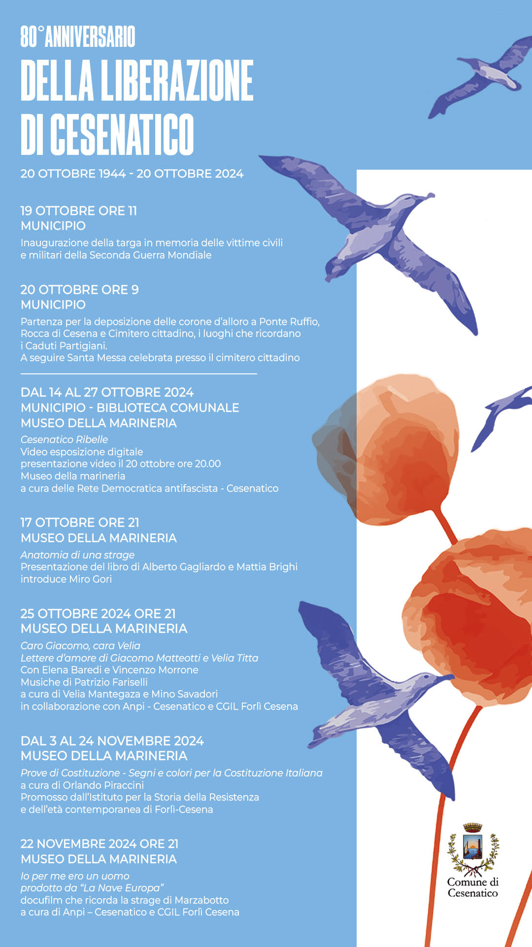 Dal 14 al 27 ottobre andrà sarà disponibile la video esposizione digitale "Cesenatico Ribelle" a cura della Rete Democratica Antifascista di Cesenatico sulla facciata del Municipio, della Biblioteca Comunale e del Museo della Marineria; Il 17 ottobre alle ore 21 al Museo della Marineria si terrà la presentazione del libro "Anatomia di una strage" con gli autori Alberto Gagliardo e Mattia Brighi che dialogheranno con Miro Gori; il 25 ottobre alle 21 sempre al Museo della Marineria andrà in scena "Caro Giacomo, cara Velia" - Lettere d'amore di Giacomo Matteotti e Velia Titta con Elena Baredi, Stefano Fariselli e Mino Savadori a cura di ANPI Cesenatico e CGIL Forlì-Cesena; Dal 2 al 24 novembre si terrà la mostra "Prove di costituzione - Segni e colori per la Costituzione Italiana" a cura di Orlando Piraccini, promossa dall'Istituto per la Storia della Resistenza e dell'età contemporanea di Forlì-Cesena. Il 22 novembre alle ore 21 al Museo della Marineria invece è in programma la proiezione del docufilm "Io per me ero un uomo" in ricordo della strage di Marzabotto a cura ANPI Cesenatico e CGIL Forlì-Cesena.