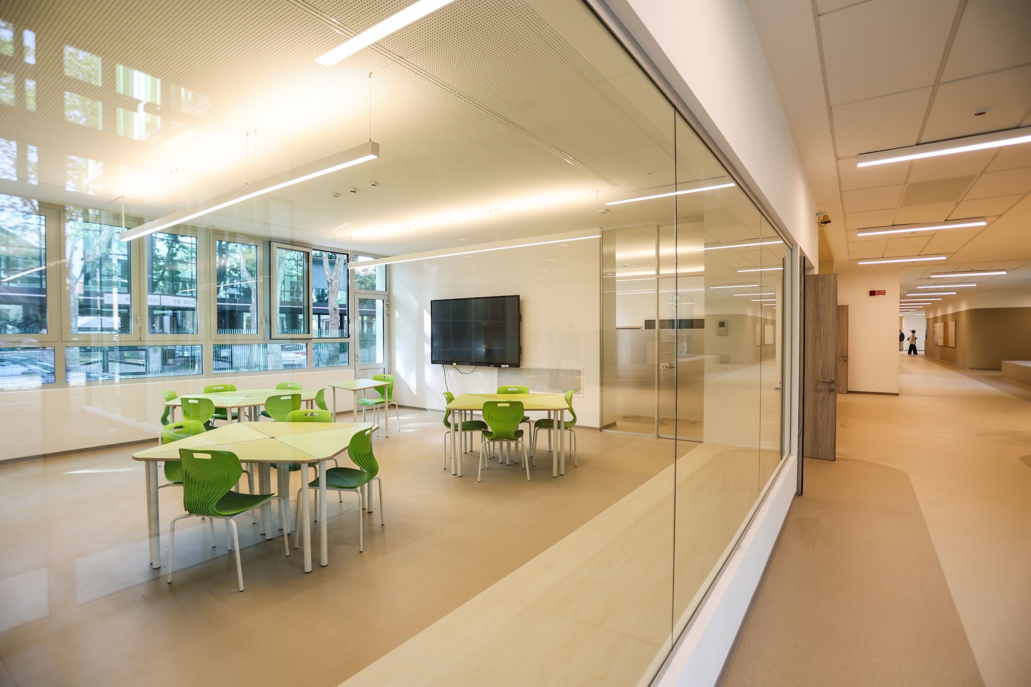 L’atrio passante di ingresso costituisce una vera a propria agorà a doppia altezza, caratterizzata da una gradonata che mette in connessione il piano terra con il primo livello e che configura tale ambiente ad auditorium e a luogo polifunzionale per manifestazioni collettive. Mentre la piazza lineare costituisce il cuore della nuova scuola, uno spazio vibrante e polifunzionale che attraversa l’edificio e connette fisicamente e simbolicamente le attività scolastiche: luogo di incontro, apprendimento, gioco, lettura, teatro e mensa. I percorsi diventano esperienze, gli spazi distribuitivi si trasformano in ambienti educanti. Gli atelier condivisi tra coppie di classi sostituiscono poi i laboratori isolati, a supporto della didattica laboratoriale e sperimentale.