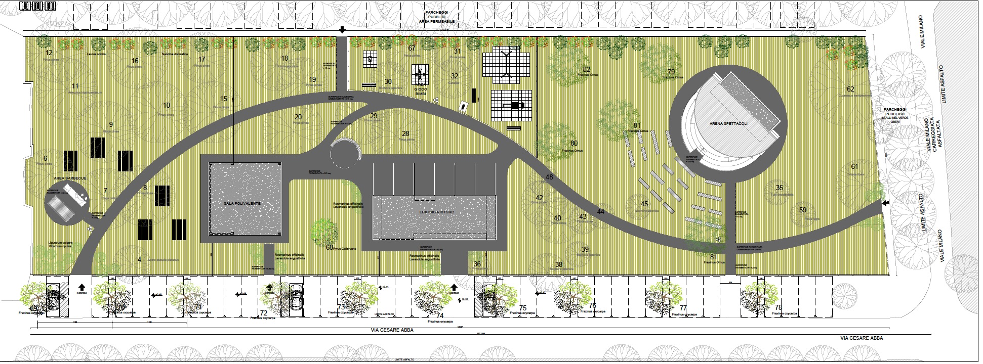 Come previsto dal bando di gara i concessionari avranno l’obbligo di sistemare i parcheggi esterni all’area lungo le vie Abba e Manzoni mentre il progetto presentato dai concessionari prevede la realizzazione di un manufatto adibito ad arena spettacoli che sorgerà ad angolo tra le vie Manzoni e Milano, una sala polivalente per attività ludico-sportive, un’area barbecue, un’area gioco bimbi e la sostituzione del manufatto esistente adibito a piccola ristorazione e di superficie pari a 60mq.