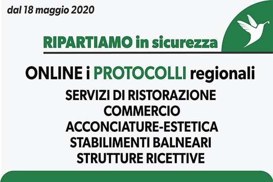 La Regione Emilia-Romagna ha condiviso dei protocolli di sicurezza con associazioni di categoria, imprese, sindacati ed enti locali di ogni comparto (commercio, ristorazione, turismo, stabilimenti balneari, alberghi, strutture ricettive e ricreative, servizi alla persona). Contengono linee guida e indicazioni operative che salvaguardino la salute di operatori economici, lavoratrici e lavoratori, clienti e persone, permettendo lo svolgimento in sicurezza delle attività stesse e la prevenzione della diffusione del coronavirus.
