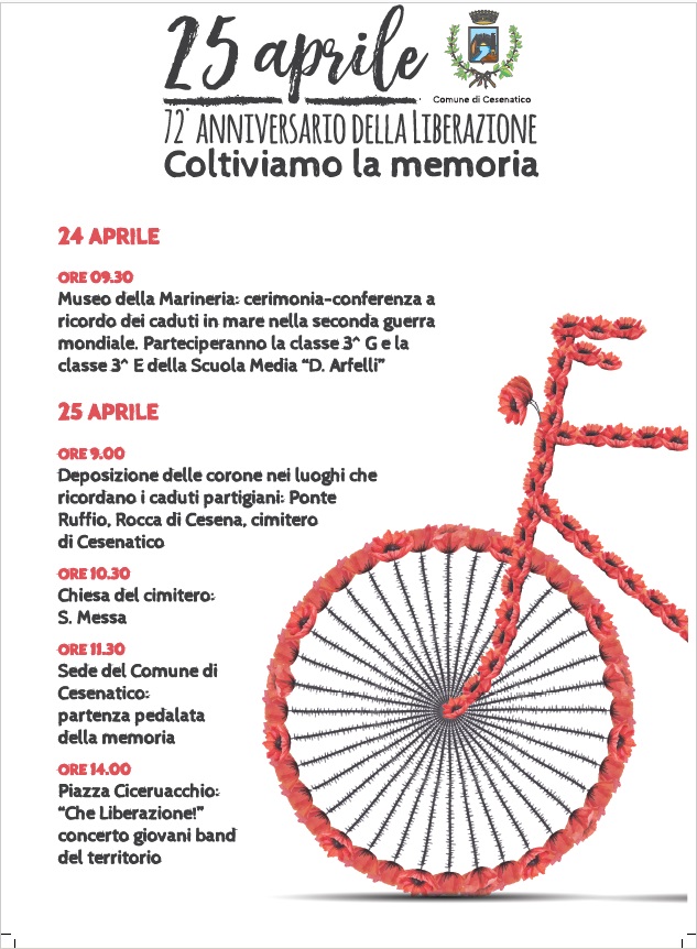 Sono diverse le iniziative in programma a Cesenatico per ricordare il 25 Aprile in occasione del 72° anniversario della Liberazione. “Coltiviamo la memoria” è lo slogan scelto dall’amministrazione comunale che ha organizzato una serie di manifestazione volte a mantenere vivo il ricordo di quanto avvenne settantadue anni fa attraverso momenti di celebrazione, di riflessione e anche conoscenza del territorio attraverso una passeggiata in bicicletta lungo le vie e i luoghi cittadini dedicate ai martiri della Resistenza.