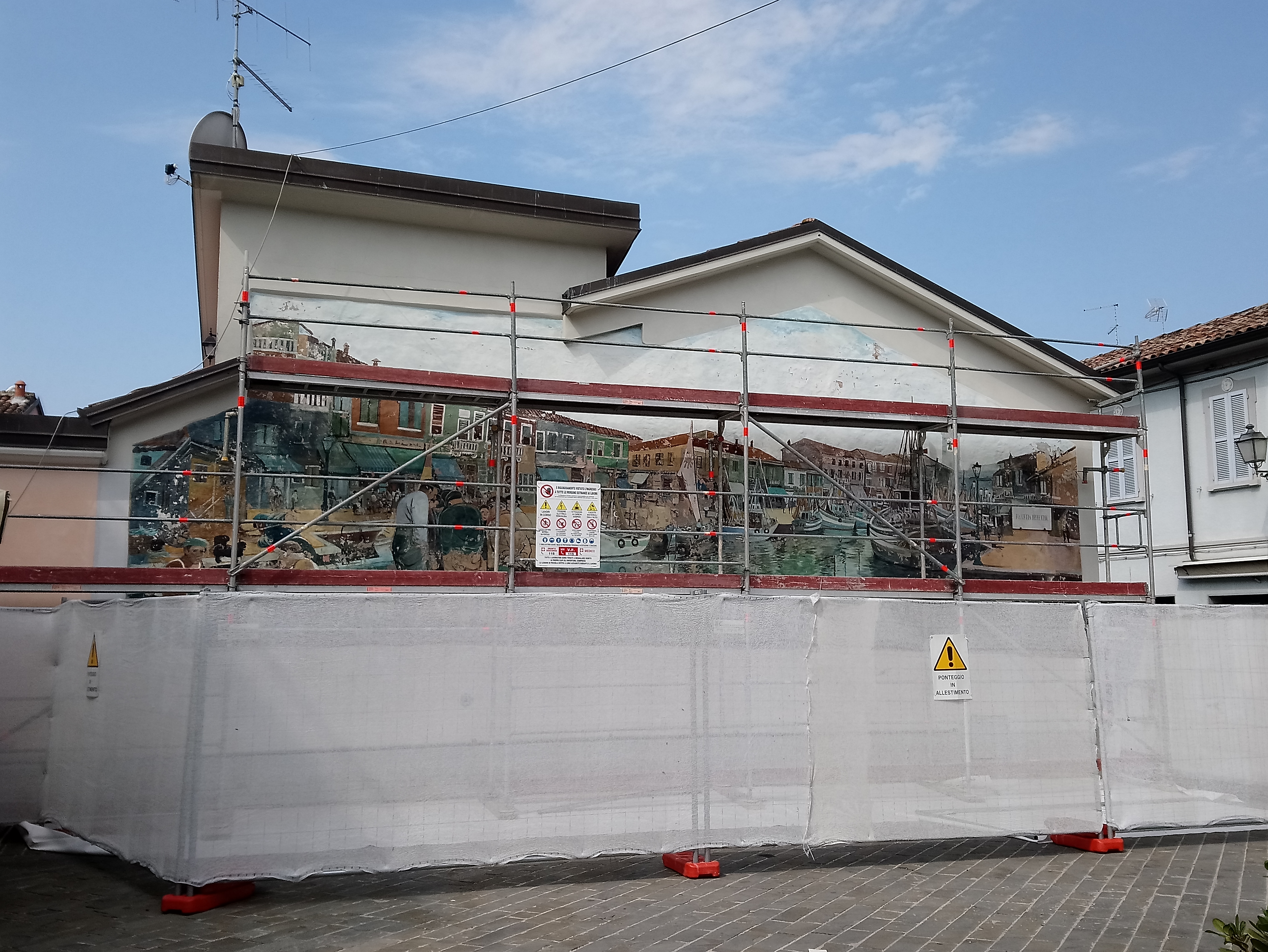n settimana sono iniziati i lavori di rifacimento del grande dipinto murale intitolato “Veduta del porto canale” e realizzato nel 1975 dall’artista Walter Masotti su una parete di un’abitazione situata ad angolo tra piazza delle Erbe e via Fiorentini.